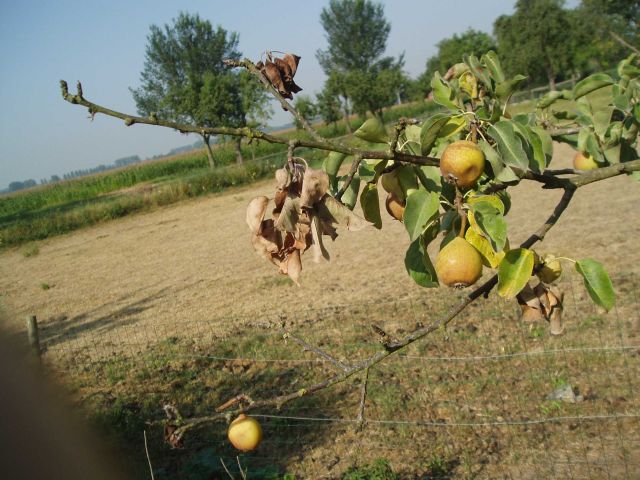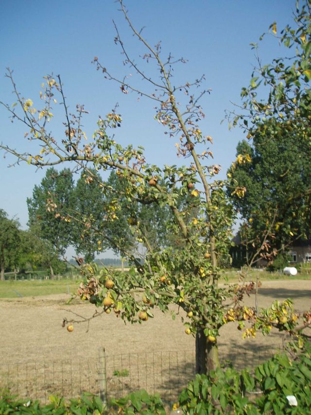 | Fruit valt onrijp van de bomen Momenteel bereiken ons uit verschillende delen van het land berichten, dat de fruitoogst er in verband met de aanhoudende droogte zeer ongunstig voorstaat. Zo werd ons uit Geldermalsen medegedeeld dat de appels en peren, hoewel nog geenszins rijp, van de bomen vallen. Uit het Land van Heusden en Altena wordt bericht, dat ook daar het fruit veel geleden heeft. De meest pessimistische berichten komen echter uit de Betuwe. Ook hier valt veel fruit af of hangt verdroogd aan bomen of struiken. Ook voor de veestapel wordt de droogte funest. Overgenomen uit Brabants Dagblad 21 juli 2006 Bijgaande foto’s laten zien dat anno 2006 de situatie dezelfde kant uitgaat. Het betreft hier een circa 10 tot 14 jaar oude boom, die nooit echt goed aangeslagen is, maar nu echt het loodje legt. Met dank aan Koning Zomer.