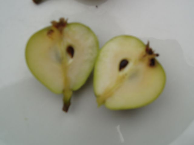 De Dirkjesperen hangen in trosjes, zijn ongelijk van grootte en ongelijk rijp. Opvallend is dat in de kelk een bruin oog lijkt te zitten. Dit zijn restanten van de bloesem.