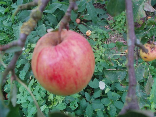 Deze oranje James Grieve stopte er een stukje eerder mee dan zijn achterbuurman en zal binnenkort vroegrijp vallen. In de rubriek Wondere Fruitwereld in beeld elders op deze webstek leidde dat tot mooie plaatjes. Van een boom met feestverlichting en een toverbal. Deze oranje geworden appels waren een lust voor het oog van de hobbyteler. De appelboom redde zich uit een gebrek aan vocht en een overdaad aan hitte door nogal enkele appeltjes vroegtijdig te laten rijpen en afvallen. Ook bleven nogal wat appels achter. Na de eerste pluk circa 24 augustus aan de boom achtergelaten groeiden deze nog wel enigszins, maar de gebruikelijke grootte kregen ze niet meer. Niettemin, de oogst aan goede appels was best redelijk. Ze zijn niet lang houdbaar; eind september of met een beetje geluk de eerste weken van oktober houdt het op. De appel wordt dan melig . Daarmee houdt het requisitoir op. Laten we de goede eigenschappen bekijken. De goede punten van het ras Afgezien van kurkstip en een zekere gevoeligheid voor kanker is de appel praktisch resistent tegen veel ziektes en kwalen. Hij draagt praktisch elk jaar. De vruchtbaarheid goed en vroeg. Hij is een goede bevruchter voor veel appelrassen, en alleen daarom al een aanwinst in de boomgaard. Onder andere Ingrid Marie, Jonathan, Cox Orange, Golden Delicious worden door hem bevrucht. Hij heeft een zachtzuur, aangenaam zeer fijn aroma. Hij is mooi: geelachtig met scherpe rode strepen, soms een rode blos