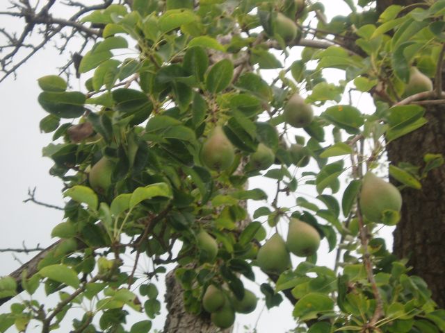 Enkele nogal slap hangende takken met Kilse Suikerperen. Ze ogen wat mat-groener dan reguliere Noord-Hollandsche Suikerperen, en her en der is een ossenbloedachtig rood wazig blosje te zien aan de zonzijde.