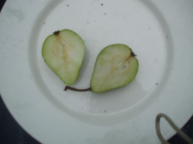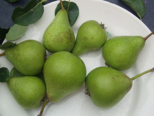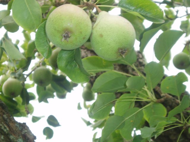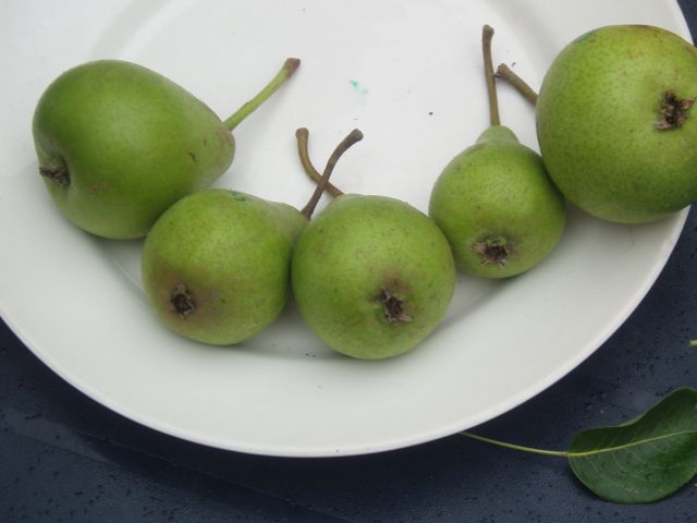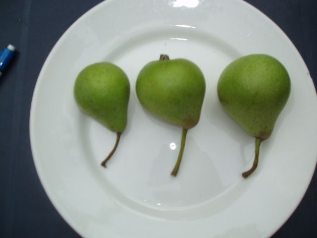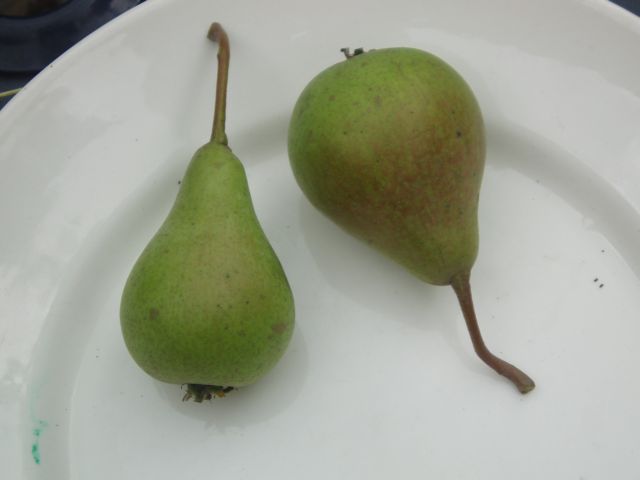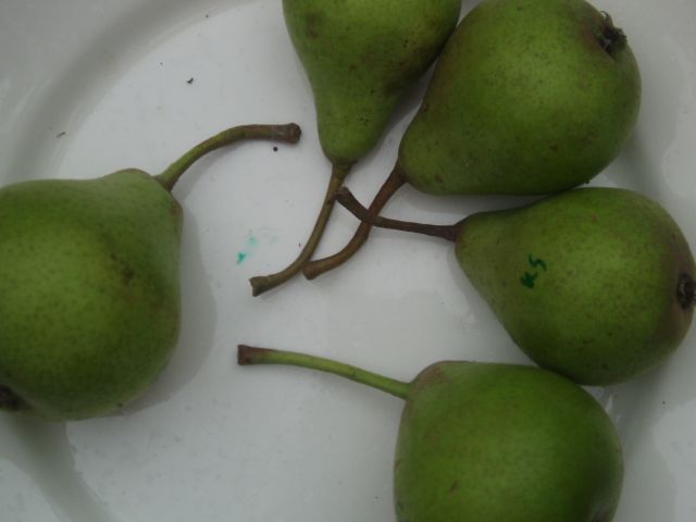 De 2 grote gewone versus de 5 kleinere Kilse Suikerperen. De gewone hebben net een iets helderder groene uitstraling, de Kilse zijn matter, wittiger groen. Dit valt aan de boom des te meer op, aangezien je dan vooral aan de zonzijde nogal eens een donkerrood waasje ziet. Bij de Noord-Hollandsche heb ik ooit in de hete juli 2006 tegen het rijpen een helrood blosje ontdekt, bij een enkele zongeblakerde peer.