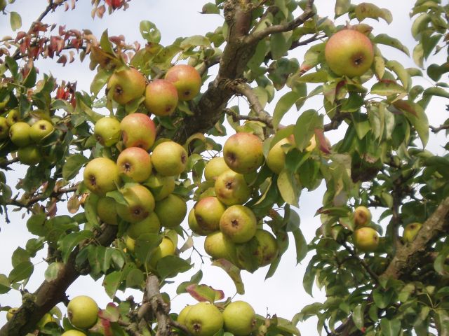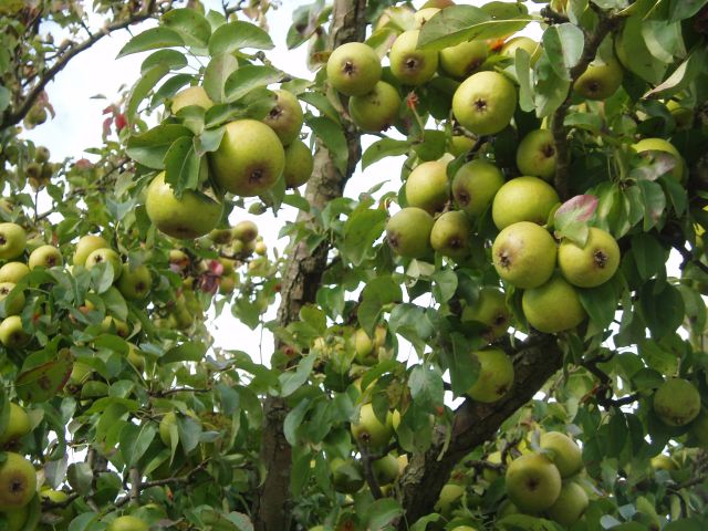 | Ze zien er rijp uit, deze Boerengroentjes. En dat zullen ze ook zijn. In het voorjaar, na vele zonnige dagen, zagen ze nogal rood, volgens de buurvrouw van de boom voor de 2e keer in 25 jaar. Deze rode kleur is geen gewoon jeugdrood, maar wordt alleen aangetroffen bij uitbundige zonneschijn in de zomer of voorzomer, zoals vorig en dit jaar. Iets wat De Greeff al rond 1905 al beschreef. Nu zijn alleen enkele meest zonbeschenen takken nog voorzien van peren met een rood blosje.Voor de rest doen ze allemaal hun naam eer aan.