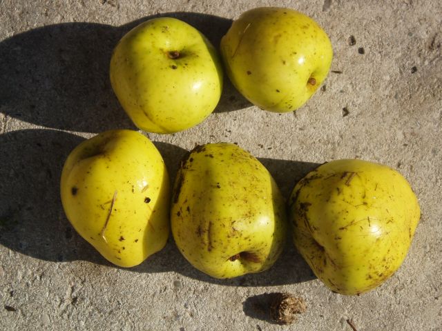 | Aan de oostzijde van een dijk, beschut tegen de ergste wind, stond ie. Een hele dikke, oude boom. De moderniserende boer wou hem eigenlijk omzagen, maar ik mag in ieder geval nog enthout komen halen. En misschien laat de boer hem nu wel staan, omdat ie gehoord heeft dat ie echt iets bijzonders heeft staan. Eén appel hing nog aan de boom. De rest lag er onder. Het ras? De Pomme du Halder komt qua vorm en uiterlijk in de buurt. Zie zijn afbeelding in De Nederlandsche Boomgaard anno 1868. De Du Halder wordt in maart goudgeel, zegt De Boomgaard. Ik denk dat deze appel zelfs de maand november niet haalt, dus de vluchtige determinatie Du Halder, die lijkt mij fout. Wijze heren pomologen, weerom uw hulp gevraagd om het ras van deze oude heer te determineren!