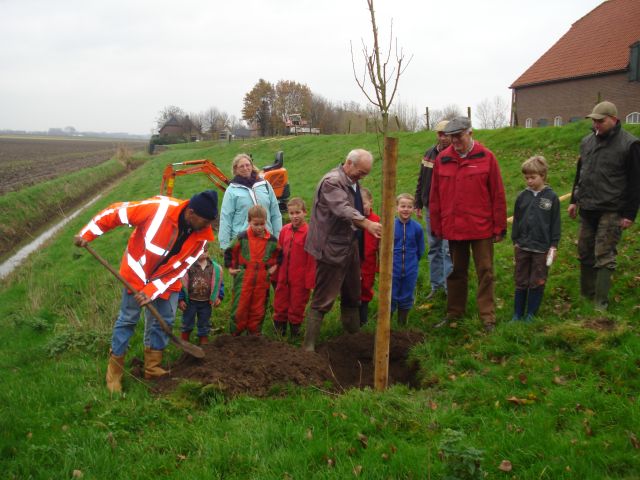 Peerenboombewoner Wout Wagemakers houdt de perenboom vast, die aan zijn dijk wordt geplant. Rechts van hem ANV-voorzitter Bastiaan Snoek (rode jas). Links achter hem Mengolda van Andel, voorzitter van de ANV-werkgroep Landschapselementen INFORMATIE: Mengolda van Andel 0416 - 39 18 58. Kijk ook op www.anv-altenabiesbosch.nl
