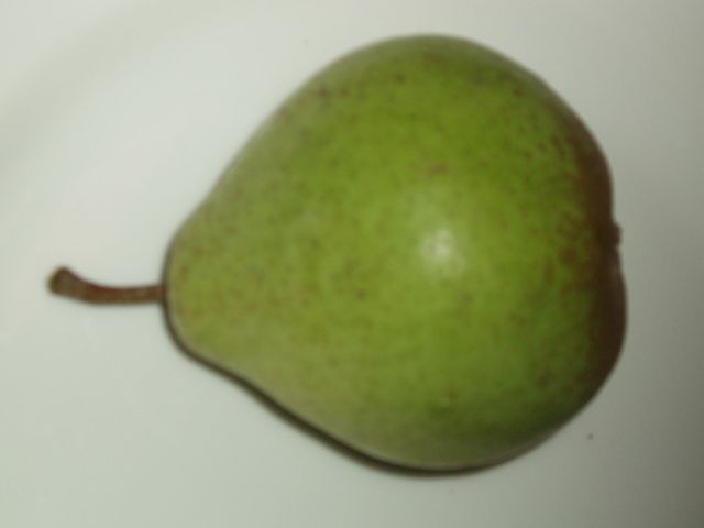 De vruchtenDe boom kan rijk dragen. De vruchten zijn middelgroot, maar ongelijk van grootte. Zij hangen aan een tamelijk korte, vrij dikke, soms iets kromme steel. Die steel staat als het ware in een afgerond kratertje ingeplant. Aan één kant is het afgeronde kratertje vaak hoger.De vruchten zijn, de naam zegt het al, opvallend groen. Wat roest bij de steel en vooral bij de kelk hoort bij het ras. Verder staan er over de hele schil bruine stippeltjes. In de herfst treedt buiten een lichte vergeling op. Die treedt niet bij alle peren op. En als hij optreedt, is dat niet bij alle peren even sterk. Bij een heel enkele peer die pal in de zon hangt zonder bladschaduw is een heel licht blosje nog net te zien.