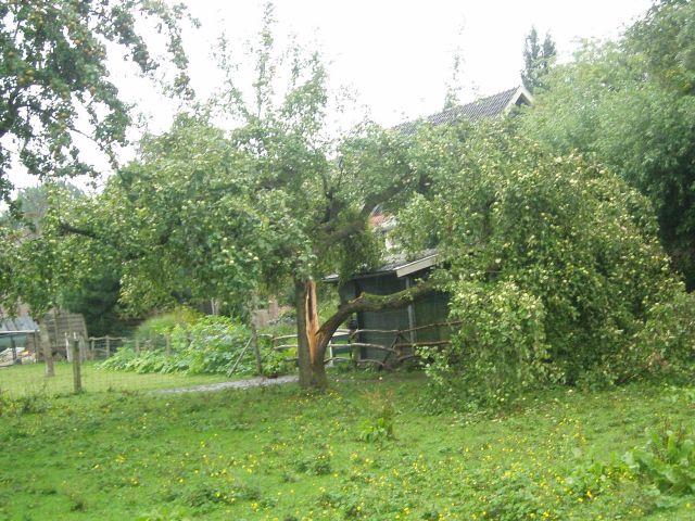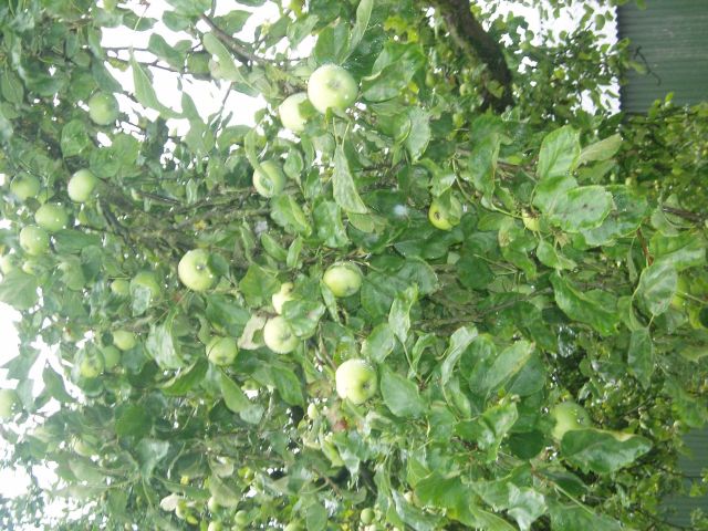 Nogmaals de boom, gefotografeerd vanuit het zuiden. Het blosje dat de sommige appels hebben richting de zon is niet of amper te zien. Wel is te zien dat de boom, net als zijn Rode mede-Wijnappel, vooral de breedte kiest. De waarschuwing uit het verleden dat de boom in de volle wind kon afbreken was niet onterecht, blijkt hier.