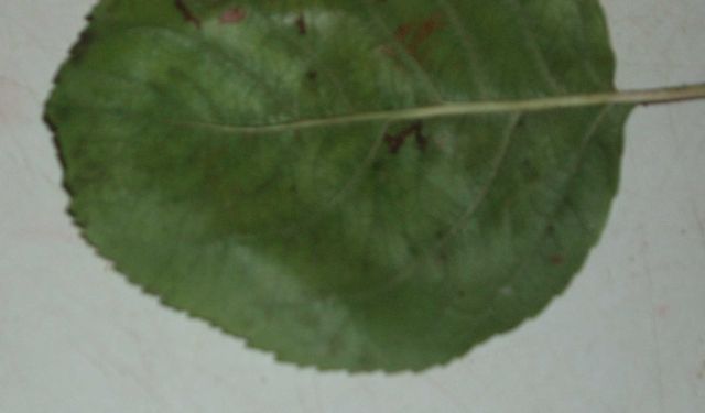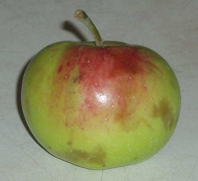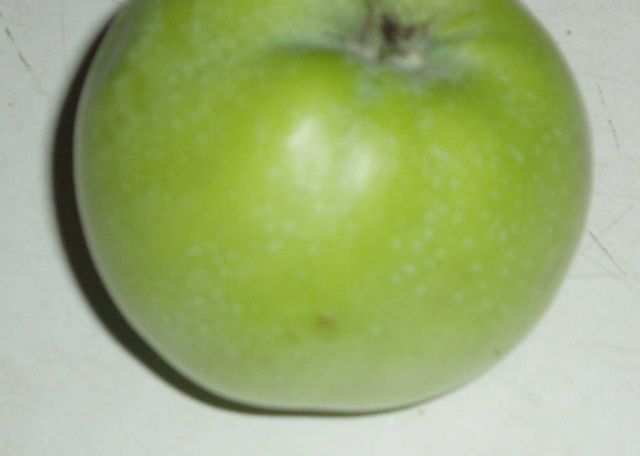 Een enkele appel van de zuidkant van de boom vertoont aan de zonzijde een blosje. Zonnebrand door standplaats op zeeklei-bodem op een windluwe plek? Alle foto’s: Bas van Andel |