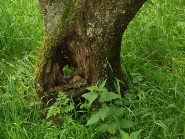 Hol hout draagt soms brede kruinBijgaande 2 foto's betreffen één en dezelfde boom. Onder is de stam hol. Je kijkt er dwars doorheen. Boven zie je een brede pruik met mooie appels. Voor de goede orde: dit is de grootste, breedste, weldragendste van de bomen die toch wel een halve eeuw oud zijn.
