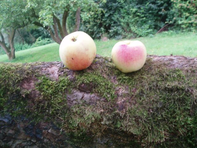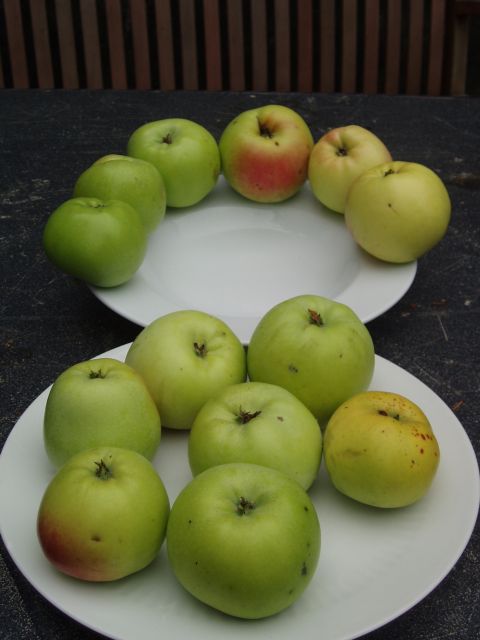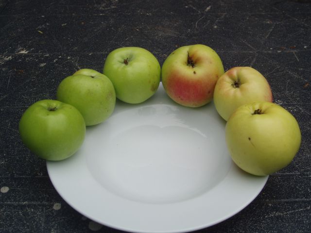 Ongelijke rijpingOp onderstaande foto liggen Eethense Wijn appels die ik vandaag raapte en plukte. De foto laat zien dat alle stadia van rijping tegelijk voorkomen. Aan de ene zijde van het bord zien we nog de vettige waslaag, bij appels zo groen als peterselie. Aan de andere kant van het bord zijn er appels die al wit zijn, wit zoals witte wijn wit is.Nota Bene: de middelste appels met de rode blos hebben geen rode blos omdat dat bij een rijpingsstadium hoort. Nee, die blos is vanwege het op de zonzijde in de zon hangen. Maar het blosje verdwijnt, zoals gezegd, bij rijping. Groene Wijnappels worden zonder rode fase wit.