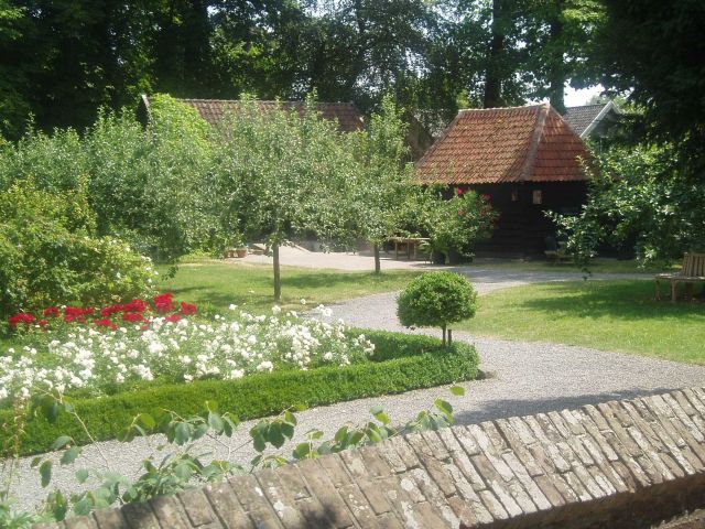 | Deze tocht leidde mij naar een kasteeltuin met (hoogstam)fruit en een kasteel met fruitbomen langs de gracht en in de weiden in de buurt. Tussendoor wandelde ik door een landgoed-bos met hoge, schaduwrijke bomen. Terwijl Nederland zuchtte in de hitte, genoot ik van de verkoeling van het oude bos en de hoogstammen. Wie de hectiek van de stad ontvluchten wil, vindt hier de rust. Fruitbomenliefhebbers krijgen uitzichten op kastelen, de Waal met zijn uiterwaarden en de Waalbrug en blikken op nostalgische (ex-) boerderijen, bijna altijd nog meer hoogstam, kado. Er zijn korte, goed gemarkeerde wandelingen uitgezet vanaf de kasteeltuin, die je gemakkelijk vindt door in Neerijnen het bordje “gemeentehuis” te volgen. Hieronder volgt een uiteenzetting van de wandeltocht, toegespitst op jou als vriend(in) van fruit en fruitbomen . De Kasteeltuin van de baron in Neerijnen De Kasteeltuin ligt tussen het kasteel met gracht van de baron, nu gemeentehuis, en de kerk, die opvalt door zijn on-Nederlands aandoende zandgeelkleurige pleisterwerk. Even uitstapje naar architectuur: