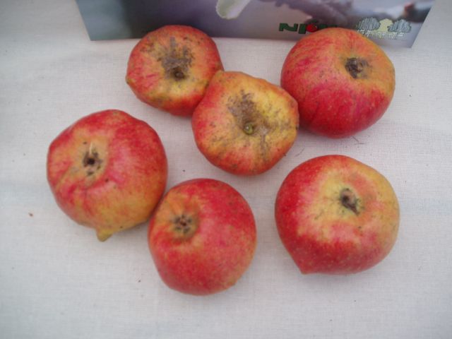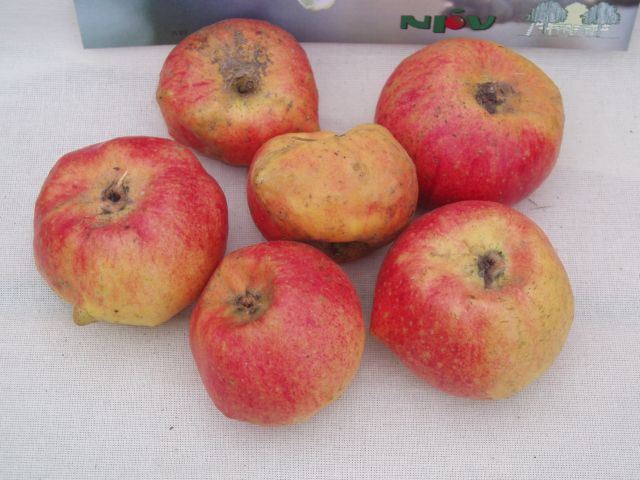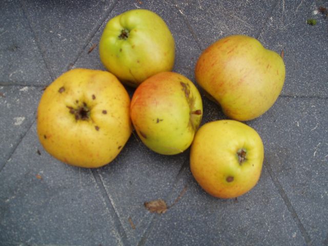 "Gewone Guldelingen" Ze zijn dit jaar niet uitgesproken "Gulden". Dat zal komen door het matige aantal zonneuren dit jaar. Maar je ziet de gouden kleur nog genoeg. Na een snoeibeurt afgelopen winter hangen er weinig, maar wel grotere Guldelingen aan. Hun smaak kun je zoet noch zuur noemen. Het lijkt er dus op, zou je zeggen, dat we op de onderste foto een "gewone" Guldeling zien. In termen van de oude pomologie lijkt het er op dat het een Zure Guldeling is, in ieder geval geen Zoete. Nou willen smaken wel eens verschillen, maar een handappel met een frisse smaak die ik niet zuur maar gewoon aangenaam fris noem, werd kennelijk in vroeger tijden "zuur"genoemd. In 1920 noemde men de Notarisappel en de Eethense wijnappel "zuur". Zie de assortimentslijst in de rubriek "historische fruitkist". Alles wat niet uitgesproken "zoet" was, zoals de Campagne en de Ermgaarde, was "zuur"! In die context hebben we hier de Zure Guldeling bij de lurven!. |