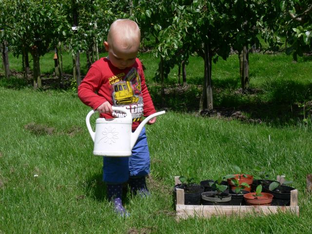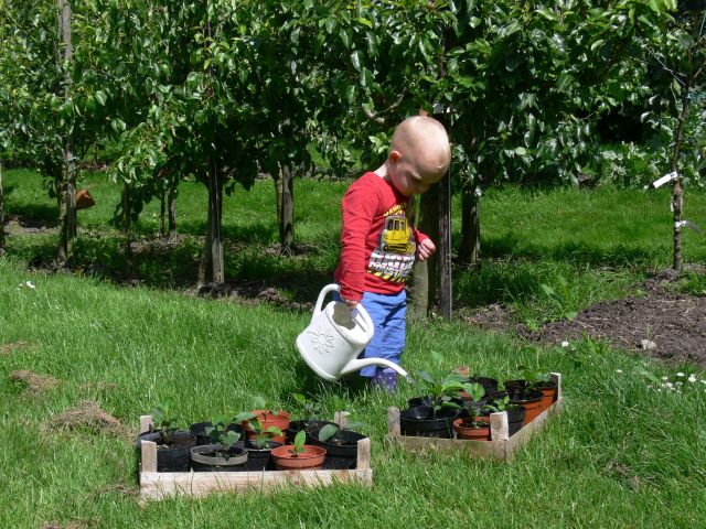| Vorig jaar zijn jullie tijdens het feest ‘Beemster 400’ bij de POM geweest. Weet je het nog? Je kon er schieten met pijl en boog, tekenen en appelstukjes uitdelen. POM Jeugd vond het toen een goed idee om met jullie appelboompjes te kweken. Jullie hebben allemaal een appelpitje in een eigen potje met zand gestopt. Alle potjes zijn in de boomgaard achter gebleven. Eigenlijk zijn we toen met elkaar aan een groot avontuur begonnen! Ook POM Jeugd weet niet precies hoe dat gaat, een appelboompje kweken….Gelukkig zijn er bij de POM een paar mensen die daar wél heel veel verstand van hebben. Meneer Houtman, mijnheer Bor en mijnheer Snel hebben uitgelegd dat een appelpitje eerst een hele winter zonder eten buiten moet rusten. Dat vonden we wel wat vreemd. Er gebeurde eerst helemaal niets. Vlak voordat het begon te sneeuwen, kwamen er opeens een paar blaadjes tevoorschijn! Die kregen het natuurlijk veel te koud en verdwenen ook weer. Ook na de winter was er eerst een hele tijd niets te zien. Pas toen het een beetje warmer werd zagen we weer wat groen naar boven piepen: kiemblaadjes. Mijnheer Bor zei dat er nu toch echt wat moest gebeuren. “Om de boompjes te laten groeien moeten ze wel wat eten” zei hij een beetje streng. “Daarvoor moet je ze in aarde zetten waar voedsel in zit.” Je begrijpt dat we meteen aan het werk zijn gegaan. Alle jonge boompjes hebben een nieuw, groter potje gekregen gevuld met plantaarde. Mijnheer Bor zei ook nog: “ Met het licht en de warmte van de zon kunnen de kiemblaadjes groter en sterker worden. Je moet wel geduld hebben. De boompjes groeien heel langzaam.” Alle nieuwe potjes staan weer gewoon buiten in de boomgaard. Daar krijgen ze genoeg licht en warmte en ook af en toe water van de regen of uit een gieter. Als je zin hebt, kom dan op 31 augustus of 21 september in de boomgaard kijken. Dan kunnen we je nog iets meer vertellen over hoe je verder kunt gaan met je boompje. We vinden het leuk als je erbij kunt zijn. Tot dan, Fruitige groetjes van POM Jeugd!