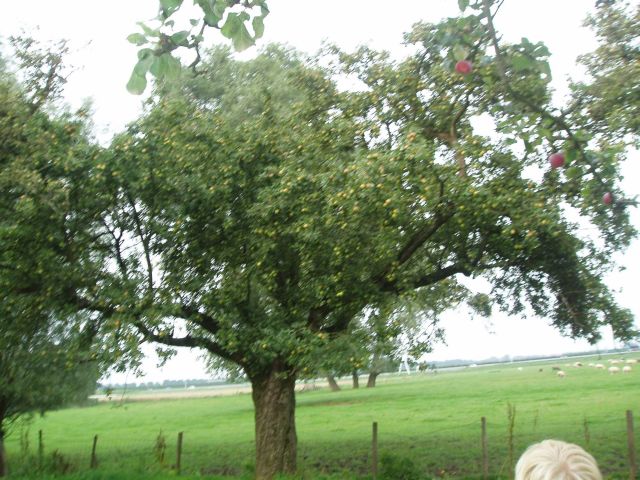Over de gevonden vruchten: zijn het echt de Zoete Kafappels? Hieronder foto’s van de gevonden boom, zijn imponerende stam en zijn mooie vruchten. Maar allereerst, kunnen we zeker zijn dat de gevonden appels de Zoete Kafappel is? De eigenaar noemde hem “Tonneke”, naar de vorm van de appel, maar kende geen rasnaam. Behalve door toetsing van de gevonden appels aan de beschrijving uit de literatuur is er één check geweest. En wel door een wijze heer Van Bommel die mij op de Kafappel gewezen had. Hij twijfelde even bij de kleur van het onrijpe fruit. Maar bij aanblik van een paar vroegrijpe valappels was hij overtuigd dat dit zijn (goud)gele Kafappels waren. De wijze man die de Kafappel zo heerlijk vond, heeft een gevonden onrijpe appel geproefd. Om precies te zijn, de meest rijpe valappel. Hij herkende de smaak van vroeger. De goede man zal komende herfst de smaak van zijn jonge jaren opnieuw kunnen beleven. En passant werd ook de naam Kafappel door hem uitgelegd. Vroeger, toen er nog geen combines waren, dorsten de boeren de korenschoven, die zij in de zomer hadden binnengehaald, in de winter. Dat gebeurde binnen, in de schuur, op de dorsvloer. Bij het scheiden van het kaf van het koren, een zwaar en stoffig werk, was de Kafappel een aangename versnapering. Hoe dan ook, vrijwel 100% zeker hebben we hier de Zoete Kafappel te pakken. Nadere verificatie bij de oude rotten in het pomologenvak zal nog plaatsvinden. De boom en zijn stam Hierna zal dit artikel vooral het karakter van een fotoreportage hebben.