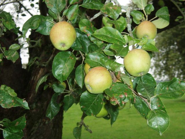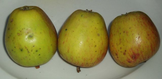 Deze drie appels, valfruit, neigen al naar de goudgele kleur die dit ras in het rijpe stadium heeft.