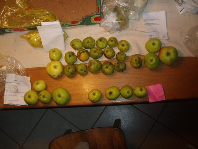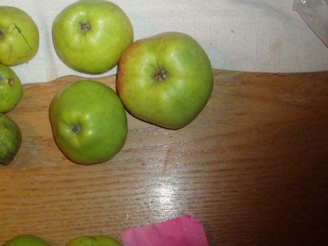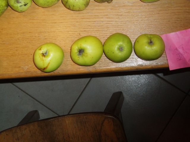 | Inmiddels ben ik een nazomer-herfstseizoen met wat tentoonstellinkjes verder. Ofschoon diverse mensen bevestigden dat "mijn" Kafappels hen bekend waren, kreeg ik ook enkele mensen die stelden dat zij een andere Kafappel hadden. Inmiddels heb ik van een vijftal bomen vruchten, en 8 mensen die die vruchten herkennen als Kafappel. De eerder als Kafappel benoemde Kafappel lijkt bij nadere bevraging van de eigenaresse een september-appel te zijn, uitsluitend goed voor appelmoes. De lijntjes soms van kelk naar steel bevestigen dan dat het een Keswick Codlin is. Tja, ook vroeger kregen bomen verkeerde namen. Op dit moment volsta ik met een foto van de door 8 mensen als Kafappel geduide appel met in het midden de "foutief" als Kafappel aangeduide appel, die Keswick Codlin lijkt te heten. Plus enkele foto's van als Kafappel aangeduide rassen. Onder de getuigen zijn een man die als 6 jarige ( hij is nu 70-plus) in de boomgaard al Kafappels kende, een hovenier die vroeger Kafappels plukte en er nog één in zijn tuin heeft staan en een professionele fruitteler die een paar takken Kafappel in een modern ras heeft ingeënt. Kortom, nogal betrouwbare getuigen! Ik durf deze foto dus gerust aan de openbaarheid toe te vertrouwen.