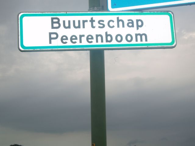 De Peerenboom staat op de kaart en de gemeentelijke bordjes Buurtschap Peerenboom omvat de oude Maasdijk . De nieuwe Maasdijk ligt op de achtergrond. Op zoek naar de perenbomen