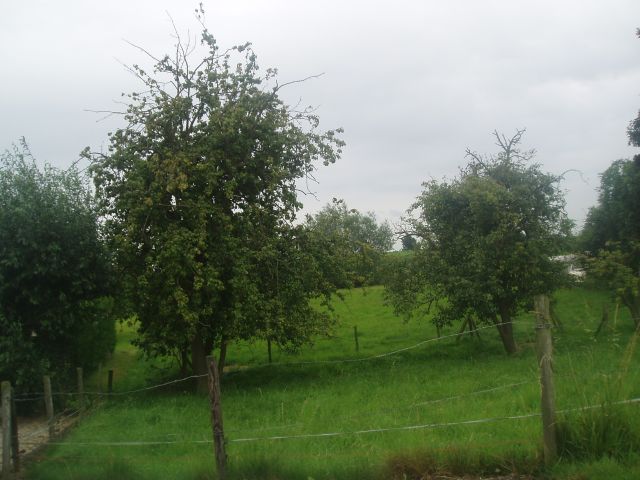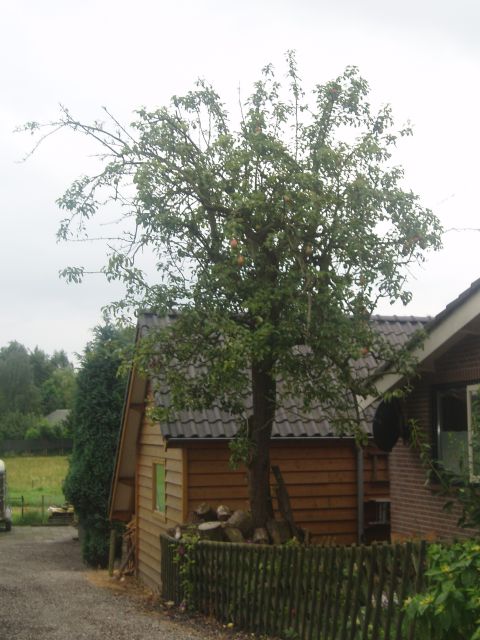 Onmiskenbaar perenaftakelingsziekte Alhoewel ik natuurlijk niet elke boom achter elk huis gezien heb, heb ik dè perenboom niet ontdekt. Niet vreemd, als je bedenkt dat hier in de winter van 1944/1945 het oorlogsfront lag en praktisch elk huis dus van na de oorlog dateert. Als er in 1944 nog een “dè” perenboom zou hebben bestaan, zou hij aan splinters geschoten zijn. Toch is er ook nog positief nieuws. Ik zie ook enkele bomen, waaronder een Zoete Brederode, die wel goed in het blad zitten en nog geen roodverkleuring vertonen. Met een foto van de laatste wel in redelijk goede staat zijnde perenbomen besluiten we deze mini-trip.