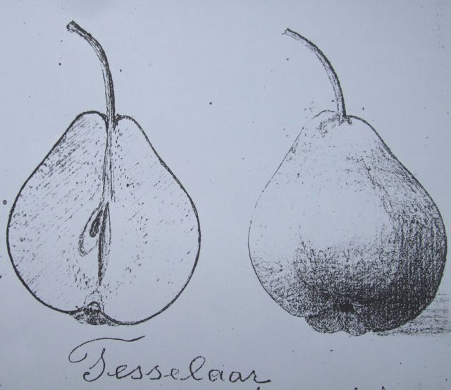 De boomkweker Admiraal uit De Rijp maakte aan het begin van de vorige eeuw een tekening van de Tesselaar - onderstaande peren lijken daar precies op.
