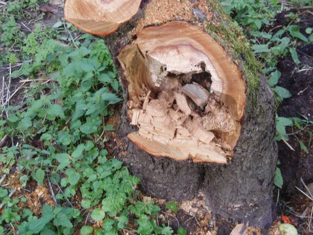Deze foto laat niets te raden over: de boom is afgescheurd door nat en vruchten. Deze boom is niet de enige die geleden heeft. Diverse bomen laten tekenen zien dat ze in het verleden takken zijn afgescheurd. Eén is er recent nog gespleten.