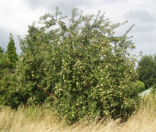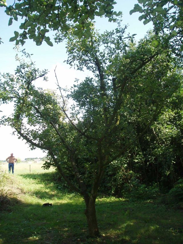![]() Een andere (Rode) Wijnappelboom. Deze boom heeft vele jaren geen snoeimeester gezien, maar heeft als solitair wel de ruimte. Deze boom, met een daarnaast staande boom met hetzelfde ras, is van origine hoogstam, maar dat komt niet meer tot uiting, mede door beschadigingen bovenin de stam. Ook hier is zichtbaar dat de boom vooral de breedte kiest.
