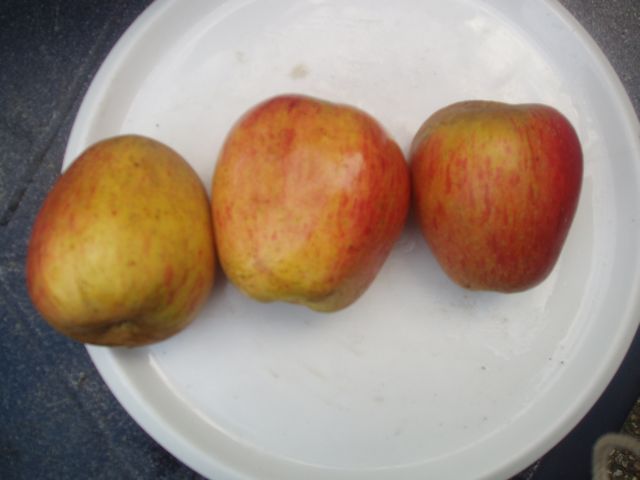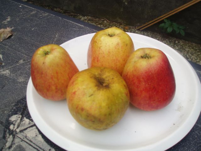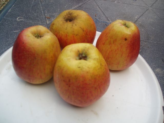| Welaan, hier zijn ze. De oude dikke boom is door vrijwilligers gesnoeid. Met als resultaat dat de oude eigenaar-baas nog nooit zulke mooie grote appels heeft gehad als dit jaar. Als je ze bekijkt, zie je waarom ze ook wel "Slanke Zoete Renette" heten. Ook de naam Kaneelzoet wordt volgens "De Boomgaard" gehanteerd. Alleen, daar zit nou net het probleem. In de rubriek "Wondere Fruitwereld in beeld" plaatste ik in september afbeeldingen van een appel met een Kaneelsmaak. De oude fruitrasliefhebber , voormalig fruitboer, noemde het ras vol overtuiging "Kaneelzoet" Maar als je die "Kaneelzoet" uit de Wondere Fruitwereld van september 2008 vergelijkt met deze Slanke Zoete Renette, zie je dat er twee vormen zijn: een korte, dikke en een lange, slanke. De korte dikke heeft de uitgesproken kaneelsmaak; de Slanke Zoete Renette heeft die veel minder. Ook de oude fruitboer ervaart dat de Slanke Renette minder uitgesproken Kaneel-achtig smaakt. Leg je de twee appels naast "De Boomgaard", het boek uit 1868, dan stel je vast dat de Kaneelzoet uit de Wondere Fruitwereld niet de Slanke Zoete Renettes volgens het boekje zijn. Voorshands de volgende stelling. Volgens "De Boomgaard"komt de Slanke Zoete Renette uit de buurt van Gorinchem. Daar is al minstens 500 jaar "professionele" fruitteelt. Er zal dus wel geëxperimenteerd en gekruist zijn met e e n Kaneelappel en zijn bijzondere smaak. Alletwee hebben ze kenmerkend kartelblad, overigens. Wellicht is de stelling gewaagd dat we een korte dikke Kaneelappel enerzijds hebben en een Slanke Zoete Renette (uit "De Boomgaard") anderzijds. Wordt ongetwijfeld vervolgd.....