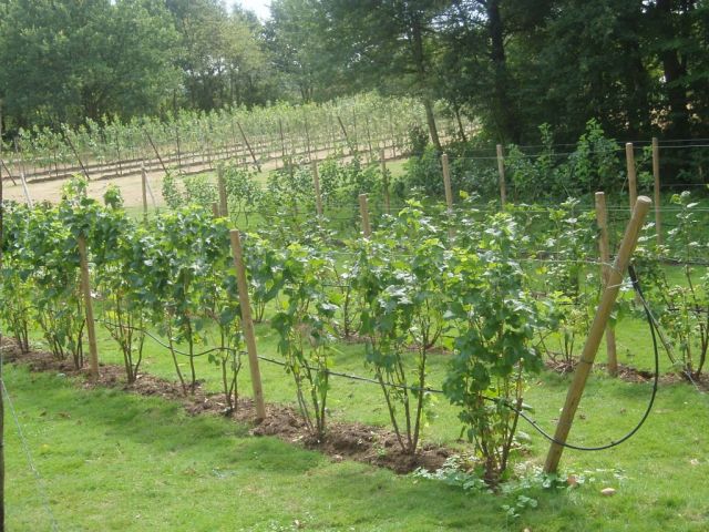 Op de voorgrond bessenstruiken die geleid worden langs geplastificeerde