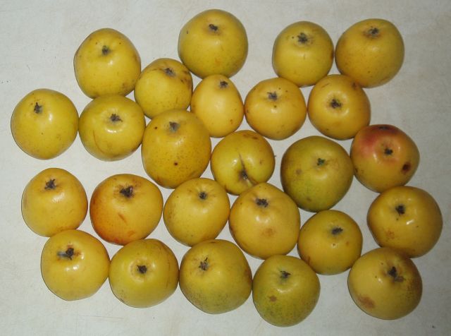 De laatste(?) Dirkappelboom, tegen de achtergrond van een populier De boom is al oud. Zijn baas laat mij de gaten in de stam zien. Hij heeft zich gerealiseerd dat de boom in het open veld staat, en daardoor extra kwetsbaar is bij windkracht 10 of 11. Daarom heeft hij enkele jaren geleden de zware takken in de top eruit gezaagd. Voor die actie kunnen de boom en ik de oude boer dankbaar zijn, want mijn inschatting is dat de boom anders waarschijnlijk al wijlen geweest zou zijn bij een stevige windvlaag in een storm of onweersbui. Nog een reden om hem dankbaar te zijn is dat de boom door de zaagbeurt volop jonge uitlopers heeft gemaakt. Hoe dan ook, de boom is er één die flink hout produceert. De vruchten Het is half oktober als ik de al een maand in de kisten staande appels zie. Ze zijn mooi geel. Enkelen zijn er met rotte plekjes. Niet verwonderlijk dit jaar 2006, met zijn extreme hete juli en september en natte augustus daartussen. Thuis zijn de vruchten vlot uitgestald.
