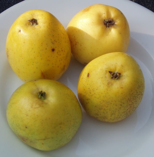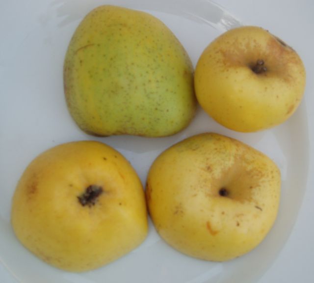 Een "zeujke" Dirkappels Ze hebben een mooie gele huid. Een beetje glimmend, bijna vettig. Op enkele plekken zij restanten van een rode blos te herkennen, zie bijvoorbeeld de appel bijna-links-voor. Deze roze blos is ook te zien bij een door wormsteek aangetast punt van een enkele appel. Bij de steel zitten roeststrepen. De kelk is vrij ondiep, maar de donkere kelkblaadjes zijn vrij groot en dus goed zichtbaar. Typerend is dat er bij de neus én ribbetjes zijn én dat het kelkgebied scheef is. De appels zijn allemaal enigszins schuin van vorm. De appel lijkt uit parten van ongelijke grootte te bestaan. Vaak zitten er bij de steel overdwars gleuven, groeven. Deze groeven lijken de appel aan de onderkant in 2 of 4 parten te verdelen. Tijd om in te zoomen op de appels
