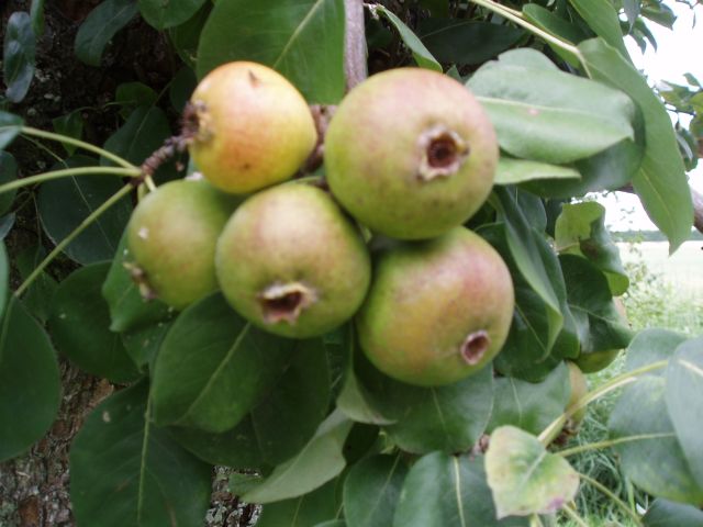De Dirkjesperen hangen in trosjes, zijn ongelijk van grootte en ongelijk rijp. Opvallend is dat in de kelk een bruin oog lijkt te zitten. Dit zijn restanten van de bloesem.