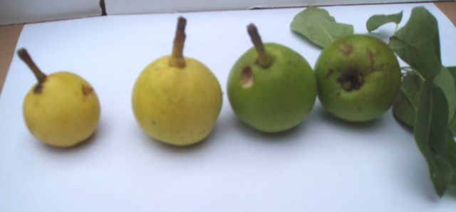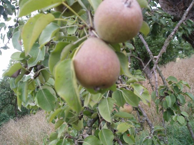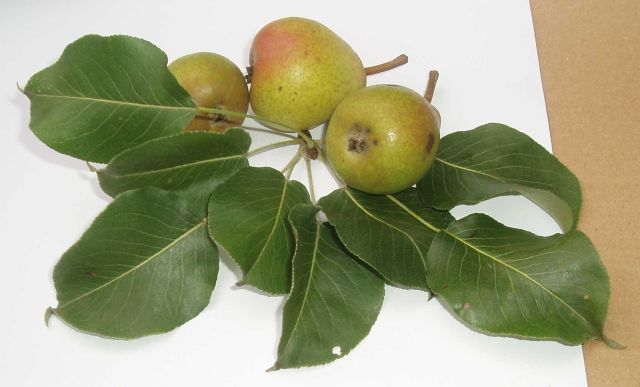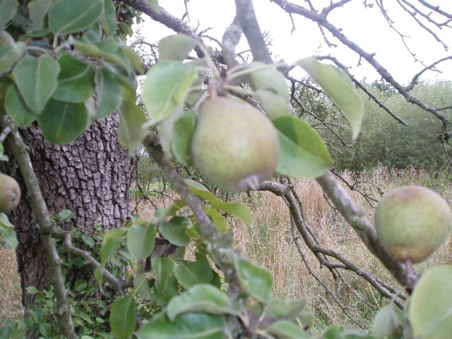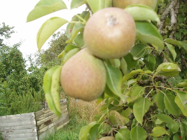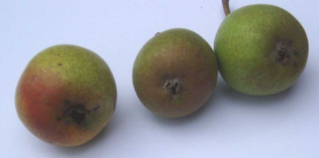 Van deze Haantjesperen zijn de onrijpe valexemplaren gefotografeerd. Dit is ook gedaan om een beeld te krijgen van hoe rijpe exemplaren er uitzien. Op de foto hieronder is alleen rechts een “vers, goed” exemplaar gefotografeerd. De peer heeft iets weg van een Knolpeer, qua schil. Maar de rode gloed onderscheidt de vrucht nadrukkelijk van de Knolpeer. Volgens de eigenaar zouden rijptijd en gebruik min of meer overeenkomen met die van de Knolpeer. In september is het een stoofpeer, die vlot overgaat in een handpeer die vlot melig is. We zullen hierop terug komen.