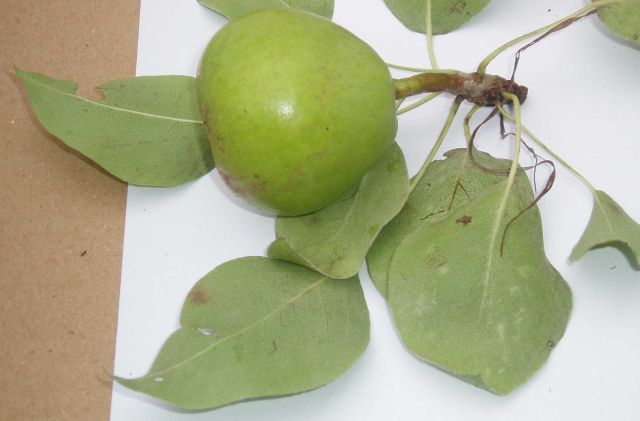 ![]() Het lukt niet om de meest interessante details van het blad op de foto te zetten. Wat je hier niet goed kunt zien is: de bladnerven vanuit de hoofdnerf zijn erg “bibberig”. In ieder geval is te zien dat –anders dan bijvoorbeeld bij de hier eerder getoonde “Rivierenlandse” Haantjespeer – de nerven erg moeilijk te zien zijn.
