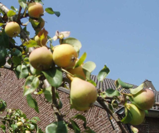 ![]() Opvallend is de ongelijke rijping/kleuring van de peertjes. Dat ziet men vooral op de foto hierboven. Er zijn er die al helemaal geel zijn. Die zijn melig en niet aangenaam meer. Sommigen hebben een rood blosje. Deze zijn “gewoon”rijp. De peertjes moeten nog een groene kleur (ook) hebben, anders zijn zij overrijp.
