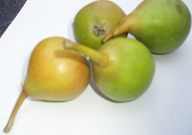 Foto’s van de peer Hieronder volgen nog enige foto’s waarop de peren in detail te zien zijn. Ook hier weer het kleurverschil dat opvalt. Alle vier de peren waren nog goed eetbaar, ook de peer linksonder op onderstaande foto. Die heeft nog een heel licht rood blosje. En ook de knalgele kleur van een overrijpe peer zoals die in eerdere foto’s te zien was, is hier nog niet aan de orde. Maar waarschijnlijk had het geen dag later moeten zijn, of deze woorden waren niet geschreven.