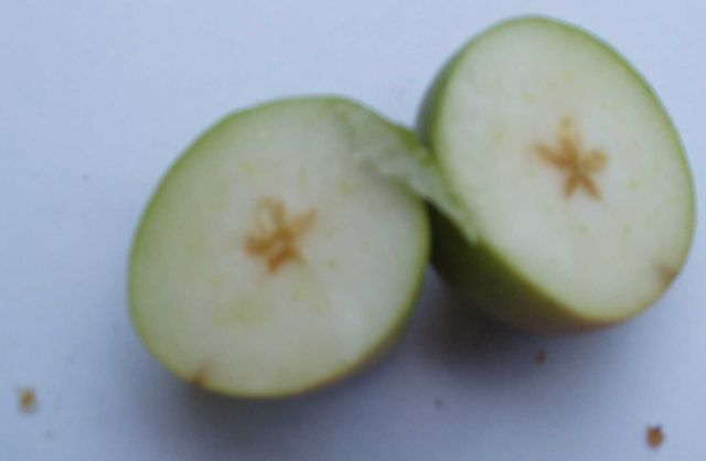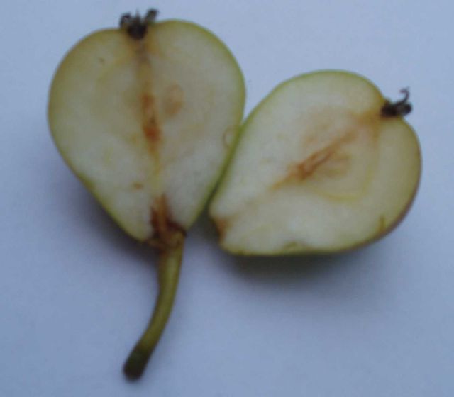 ![]() Opvallend aan de peer rechtsboven is het volgende. De steel is vergroeid met de vrucht. Deze vergroeiing lijkt een incidentele afwijking te zijn. Anatomische les rond de Janbaas Beide onderstaande foto’s geven een beeld van het inwendige van de Janbaas. Vooral is te zien dat de peer goed vastzit aan de steel. Opvallend is ook het stervormige klokhuis, zichtbaar na het doorsnijden van de peer over de breedte.
