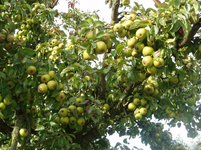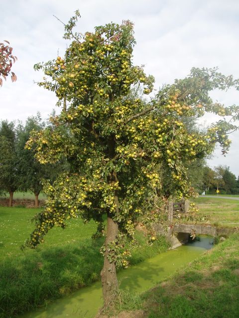 | Ze zien er rijp uit, deze Boerengroentjes. En dat zullen ze ook zijn. In het voorjaar, na vele zonnige dagen, zagen ze nogal rood, volgens de buurvrouw van de boom voor de 2e keer in 25 jaar. Deze rode kleur is geen gewoon jeugdrood, maar wordt alleen aangetroffen bij uitbundige zonneschijn in de zomer of voorzomer, zoals vorig en dit jaar. Iets wat De Greeff al rond 1905 al beschreef. Nu zijn alleen enkele meest zonbeschenen takken nog voorzien van peren met een rood blosje.Voor de rest doen ze allemaal hun naam eer aan.