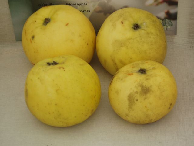 Goudappeltje. Volgens mij bestaat het merk nog steeds. Het echte gouden appeltje bestaat evenwel ook. Golden Noble, heet het dan. Gouden edele, zoiets maak je ervan. Verheven, edel, dat oogt deze appel inderdaad. Ik fotografeerde deze Engelse moesappel uit de 18e eeuw op de tentoonstelling in Frederiksoord.