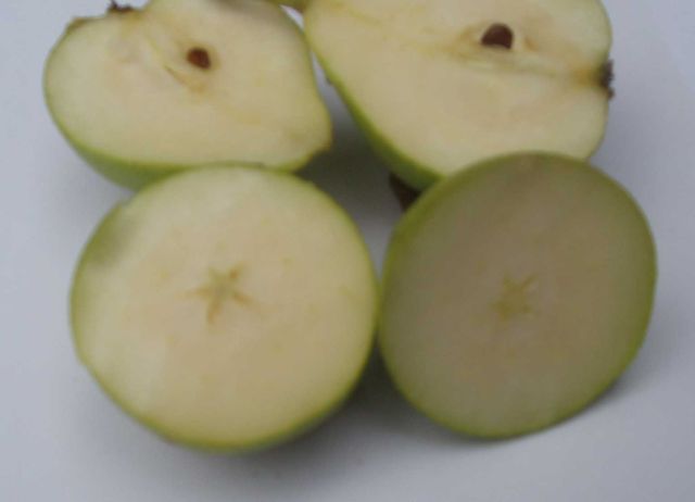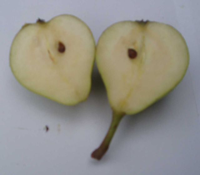 De smaak De Kruidenierspeer smaakt als rijpe vrucht zoet, en verder vooral neutraal. Het typische en uitgesproken aroma van de net eerder rijpe Janbaas proeft men hier slechts op de achtergrond. Wie van aroma houdt, treft na de Janbaas in een Kruidenierspeer een minder smakelijk maar nog wel lekker peertje. Het (vaste)vruchtvlees neigt soms naar korreligheid. De peer is iets aan de (te) droge kant. Het inwendige van de peer Onderstaande foto’s laten zien dat de Kruidenierspeer ook qua inwendig aanzien sterkt lijkt op de Janbaas. Men lette weer op de stervormige vorm van het klokhuis die zichtbaar wordt bij een horizontale dwarsdoorsnee.
