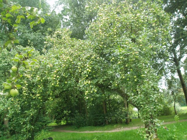 Hol hout draagt soms brede kruinBijgaande 2 foto's betreffen één en dezelfde boom. Onder is de stam hol. Je kijkt er dwars doorheen. Boven zie je een brede pruik met mooie appels. Voor de goede orde: dit is de grootste, breedste, weldragendste van de bomen die toch wel een halve eeuw oud zijn.