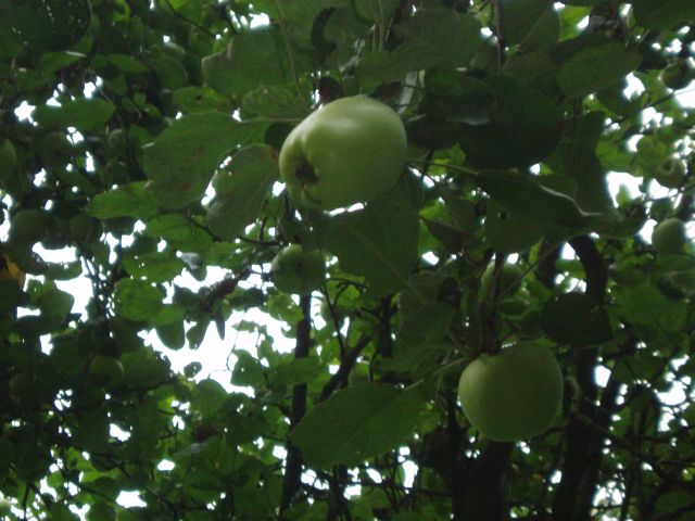 Ongelijkvormige en vettig glimmende peterseliegroene Eethense Wijnappels aan de boom |