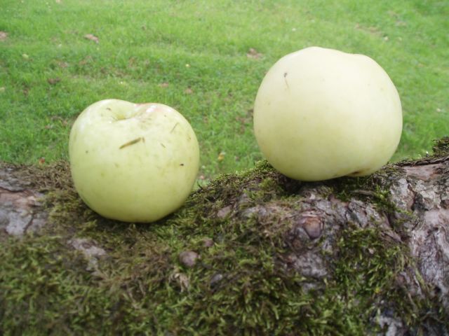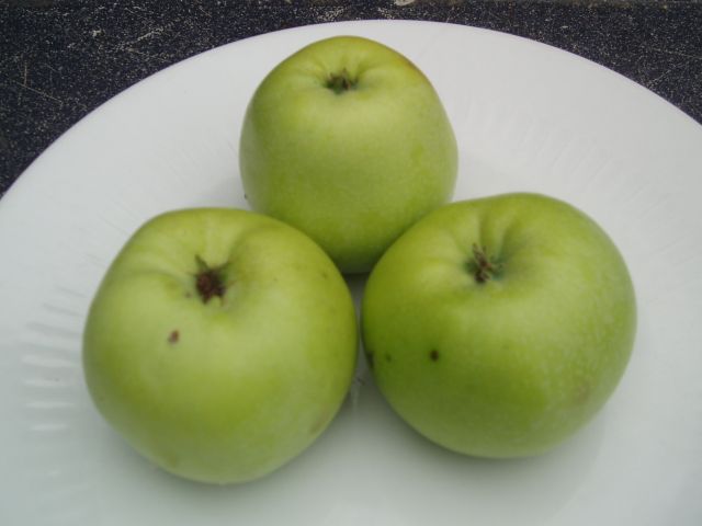 Ongelijke rijpingOp onderstaande foto liggen Eethense Wijn appels die ik vandaag raapte en plukte. De foto laat zien dat alle stadia van rijping tegelijk voorkomen. Aan de ene zijde van het bord zien we nog de vettige waslaag, bij appels zo groen als peterselie. Aan de andere kant van het bord zijn er appels die al wit zijn, wit zoals witte wijn wit is.Nota Bene: de middelste appels met de rode blos hebben geen rode blos omdat dat bij een rijpingsstadium hoort. Nee, die blos is vanwege het op de zonzijde in de zon hangen. Maar het blosje verdwijnt, zoals gezegd, bij rijping. Groene Wijnappels worden zonder rode fase wit.