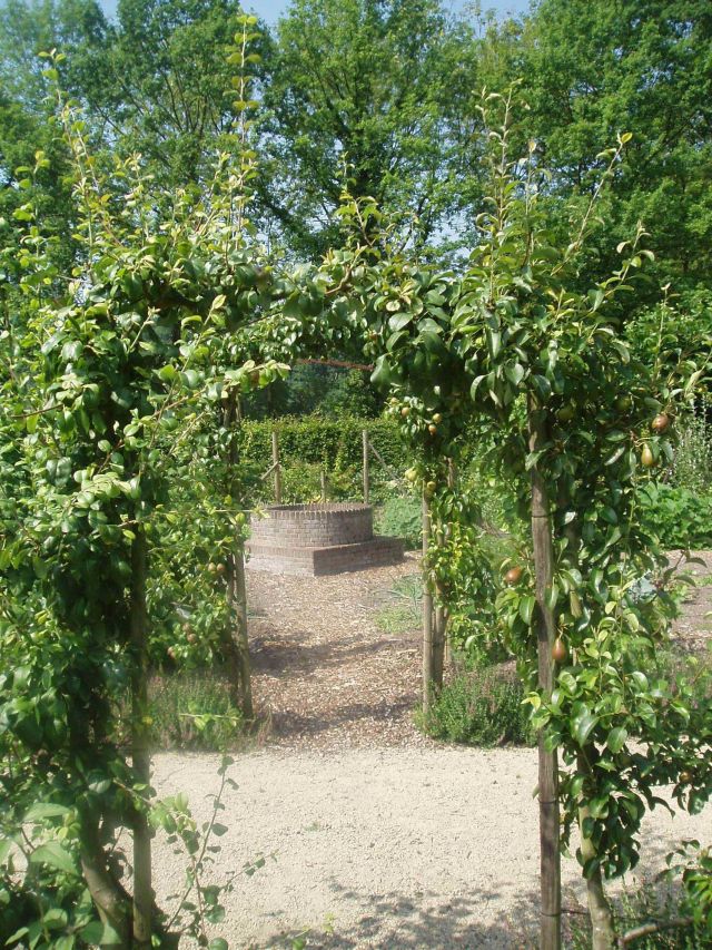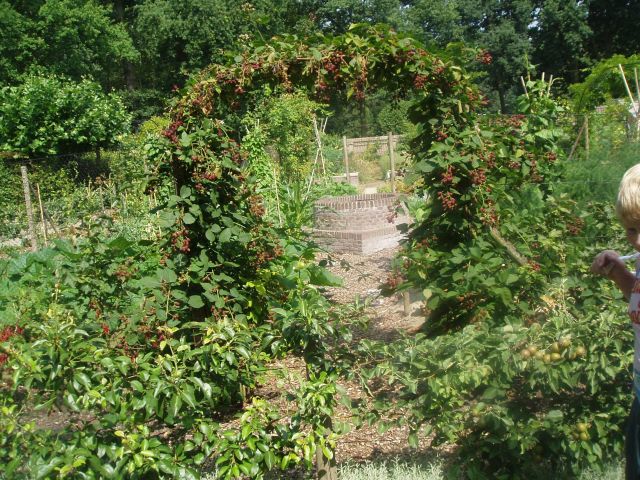 Rozenbogen begroeid met bramen of peren zijn blikvangers, evenals een kas met een “latjesgordijn”als afscherming op de zuidkant.