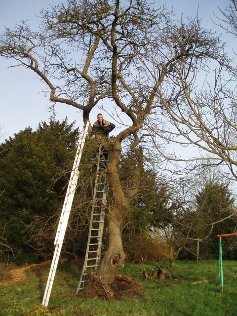 | Een imposant gezicht, een snoeier in de reuzeboom. Voor het eerst sinds minstens een halve eeuw. Over de oorsprong van het ras Gulderling, deze boom, zal ik binnenkort hier een artikel publiceren. Alvast een tipje van de sluier: het is geen Knoop-Gulderling, maar waarschijnlijk een in de 19e eeuw gekweekt ras, dat bij de meeste pomologen tot dusverre onbekend is. Op de foto zien jullie dus denkelijk een zeldzaam 19e eeuws ras!