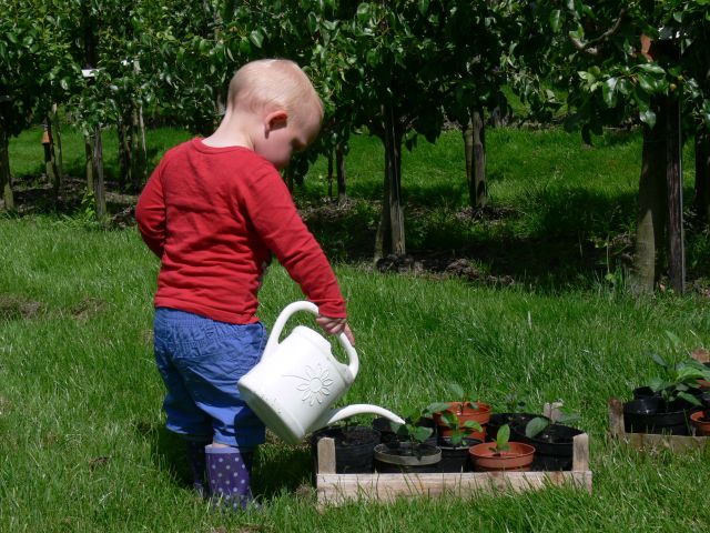 | Vorig jaar zijn jullie tijdens het feest ‘Beemster 400’ bij de POM geweest. Weet je het nog? Je kon er schieten met pijl en boog, tekenen en appelstukjes uitdelen. POM Jeugd vond het toen een goed idee om met jullie appelboompjes te kweken. Jullie hebben allemaal een appelpitje in een eigen potje met zand gestopt. Alle potjes zijn in de boomgaard achter gebleven. Eigenlijk zijn we toen met elkaar aan een groot avontuur begonnen! Ook POM Jeugd weet niet precies hoe dat gaat, een appelboompje kweken….Gelukkig zijn er bij de POM een paar mensen die daar wél heel veel verstand van hebben. Meneer Houtman, mijnheer Bor en mijnheer Snel hebben uitgelegd dat een appelpitje eerst een hele winter zonder eten buiten moet rusten. Dat vonden we wel wat vreemd. Er gebeurde eerst helemaal niets. Vlak voordat het begon te sneeuwen, kwamen er opeens een paar blaadjes tevoorschijn! Die kregen het natuurlijk veel te koud en verdwenen ook weer. Ook na de winter was er eerst een hele tijd niets te zien. Pas toen het een beetje warmer werd zagen we weer wat groen naar boven piepen: kiemblaadjes. Mijnheer Bor zei dat er nu toch echt wat moest gebeuren. “Om de boompjes te laten groeien moeten ze wel wat eten” zei hij een beetje streng. “Daarvoor moet je ze in aarde zetten waar voedsel in zit.” Je begrijpt dat we meteen aan het werk zijn gegaan. Alle jonge boompjes hebben een nieuw, groter potje gekregen gevuld met plantaarde. Mijnheer Bor zei ook nog: “ Met het licht en de warmte van de zon kunnen de kiemblaadjes groter en sterker worden. Je moet wel geduld hebben. De boompjes groeien heel langzaam.” Alle nieuwe potjes staan weer gewoon buiten in de boomgaard. Daar krijgen ze genoeg licht en warmte en ook af en toe water van de regen of uit een gieter. Als je zin hebt, kom dan op 31 augustus of 21 september in de boomgaard kijken. Dan kunnen we je nog iets meer vertellen over hoe je verder kunt gaan met je boompje. We vinden het leuk als je erbij kunt zijn. Tot dan, Fruitige groetjes van POM Jeugd!