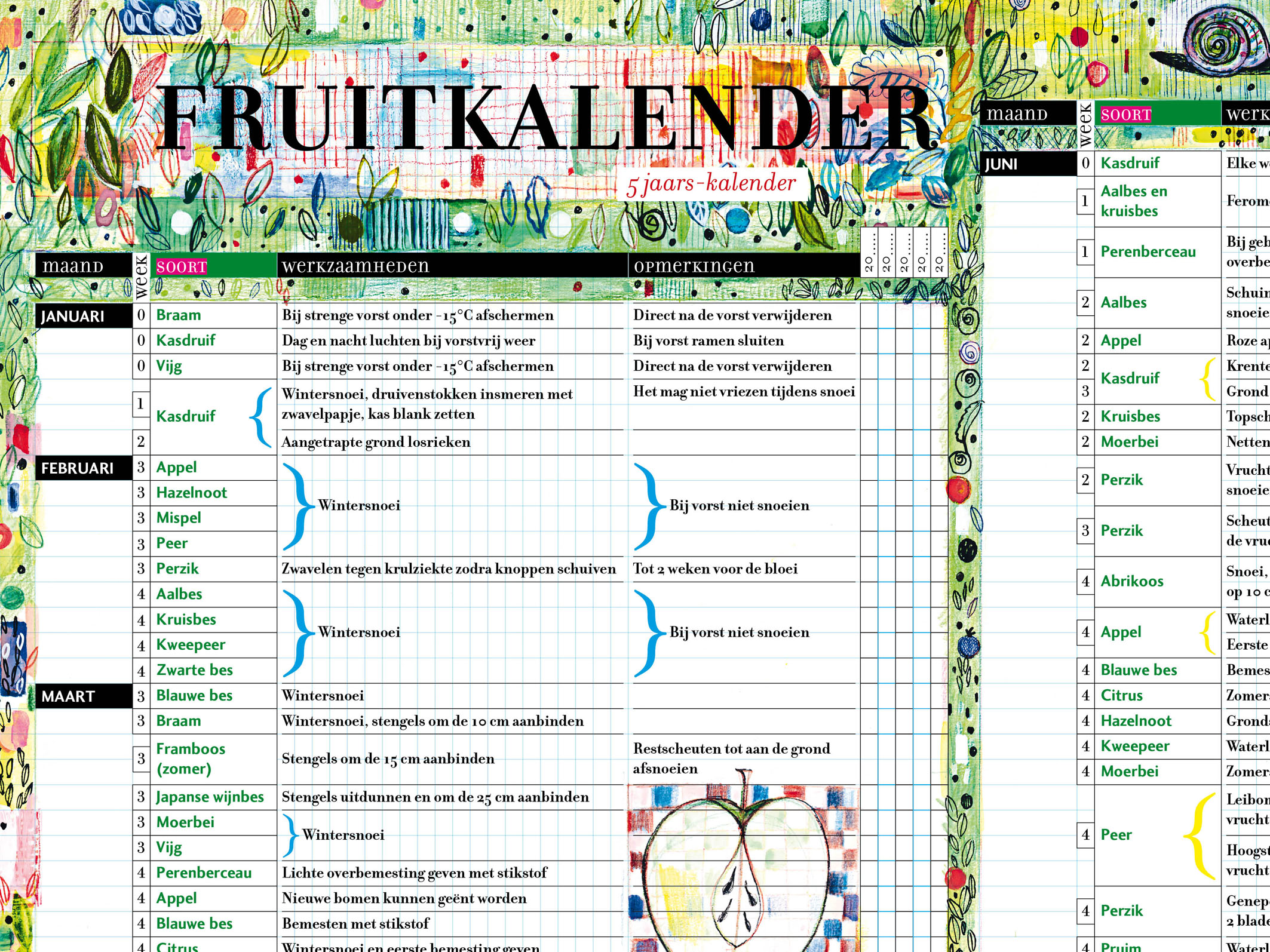 | Wanneer snoei je de framboos? Wat is het beste moment voor vruchtdunning bij de perzik? Wanneer vindt de wintersnoei van de kers plaats? De rijk geïllustreerde fruitkalender van Villa Augustus geeft met steekwoorden en korte zinnen aan welke handelingen wanneer moeten worden verricht om fruitbomen en bessenstruiken in optimale conditie te brengen en te houden. Op beknopte wijze biedt de kalender zo een enorme schat aan tuinkennis, maar veronderstelt wel een zekere kennis van tuinieren. Achter de werkzaamheden staan vakjes waarin de gedane handelingen vijf jaar lang afgevinkt kunnen worden.