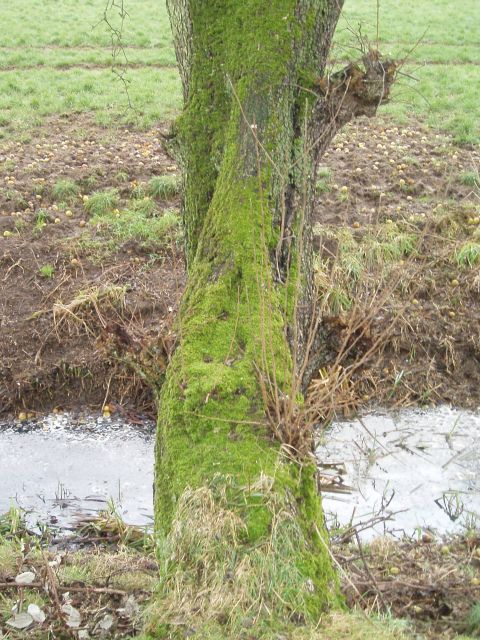 De bemoste stam, met helemaal bij de grond wilde takken en hogerop "beschaafde"uitlopers. Op de grond legio peertjes