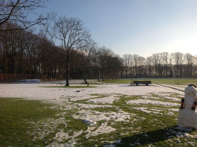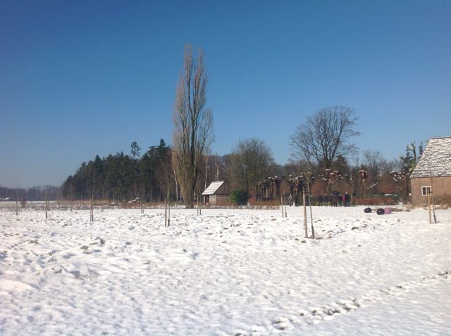 Je ziet een Italiaanse populier, die ooit met zijn collega-populieren een boomgaard beschutte. Deze ene bleef staan als markeerpunt. De vergaderboer heeft nieuwe hoogstamfruitbomen geplant . Ze vormen een mooi plaatje: de oude populier en de jonge aanplant.