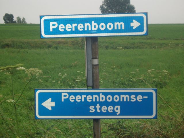 De Peerenboom staat op de kaart en de gemeentelijke bordjes Buurtschap Peerenboom omvat de oude Maasdijk . De nieuwe Maasdijk ligt op de achtergrond. Op zoek naar de perenbomen