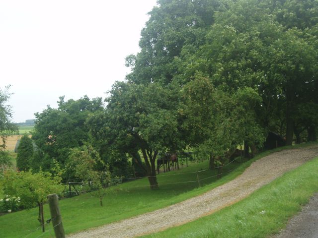 Westelijke entree met notenbomen Als je vanaf de A27 De Peerenboom binnenrijdt, wordt je onthaald door twee notenbomen die een welkomstboog over de dijk voor je vormen. Bij de ingang zijn geen perenbomen te zien; wel staan er enkele mooie appelbomen onder aan de dijk.
