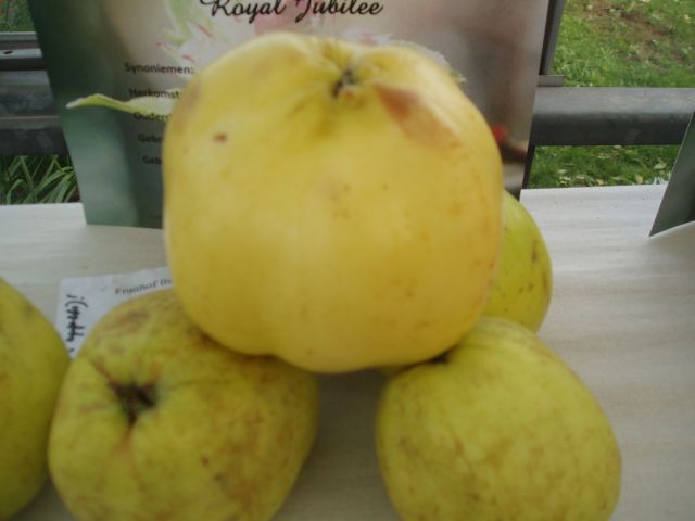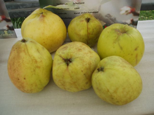 | Die Zeeuwse Peterselieappel was omstreeks 1900 in het Kapelse bedrijf geplant, nadat zijn vader daar goede voorbeelden van had gezien in de Betuwe. Het was een grove, rijkdragende tot in november houdbare moesappel, die gelijkwaardig werd geacht aan de Jacques Lebel. Hij kon tegen een stootje. De groeikracht van de boom was groot. De kleur omschrijft de Zeeuwse senior als "blauwachtig". Minder tere vruchten, die ook later afrijpen dan de eerder hier afgebeelde appels en die minder geel waren en ook geen rode streepjes hadden. Die moeten we volgens de Zeeuwse senior hebben! Dat betekent dat één raadsel blijft voortbestaan: waar is de echte Peterselieappel. En dat er een nieuw raadsel bij is: welk is dan de naam van het hier afgebeelde ras? Iemand dacht aan het ras Royal Jubilee. Ik kwam recent dit ras tegen op een fruitrassententoonstelling. Uiteraard gingen deze Royal Jubilees acuut op de foto. De aanblik van de (schil van de) Royal Jubilee verschilt echter van de aanblik van de vermeende Peterselie. Ook al geeft het Heidemij-boek uit 1942 aan dat de Royal Jubilee soms een blosje aan de zonzijde heeft. Maar ook een blosje op de hier weergegeven Royal Jubilees zou hen niet gelijk doen zijn aan "mijn" appel. Tenzij ik mij - ik ben ook maar een mens- vergis en bewaar- of groeiomstandigheden het verschil zouden verklaren. Ik heb op dit moment geen mogelijkheden definitief uit te sluiten dat "mijn "appel een Royal Jubilee is. Alleen nog dit: de Royal Jubilee heeft oktober/november als gebruikstijd. Nu moge het klimaat veranderd zijn, maar als vóór 10 oktober de laatste appels op zijn, is dat een extra aanwijzing dat we hier niet met de Royal Jubilee van doen hebben. Bovendien omschrijven mensen die "mijn" appel gegeten hebben zijn smaak als gelijkend op de Lombards Calville. De Royal Jubilee is volgens het boek van Lijsten uit 1942 geelachtig, grof, matig zuur, met weinig of geen aroma. Ook dit sterkt de stelling dat van een Royal Jubilee geen sprake is. Wordt ongetwijfeld vervolgd in 2009, met fris determinermateriaal!
