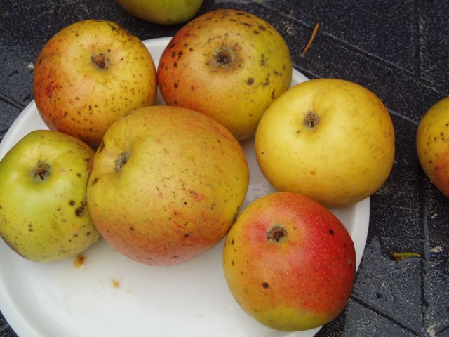 | Onderwijl had ik van onze Noord-Hollandse rassenvriend Ger Ernsting foto's gemaakt van de Reinette d'Or in de collectietuin van de POM. Deze staan in het subitem over dit ras van 26 augustus 2008. Met een markant verschil: de appels uit de collectietuin waren al wat verkleurd, mijn "vondst" was nog knalgroen. De vraag rees of we wel hetzelfde ras hadden.